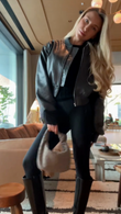 It's perfect for casual outings, as shown here, paired with a simple black top, black leggings, and knee-high boots. It can also be paired with a dress, creating a subtle contrast between femininity and edgy style. Whether you're enjoying a coffee or heading out for a night out, this jacket is the perfect choice.