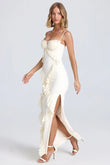 Full of charm pleated flounce skirt with split floor-length skirt. pleated process makes the flounce look elegant and smart. The ruffled edge on the chest adds to the overall shape. and the slit at the thigh lets you inadvertently show feminine charm. Suitable for banquets. parties and other occasions to wear it. with simple accessories can make your dress more perfect!