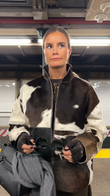 This jacket stands out with its bold, eye-catching pattern. Brown and white patches mimic the grain of cowhide, giving it a fashionable, edgy look. The zipper closure and high collar create a practical yet edgy look.