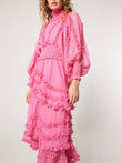 The stand collar adds an element of regal charm to this dress, framing your face beautifully and adding a touch of refinement. The tiered ruffles cascade gracefully down the bodice and skirt, creating a sense of movement and drama that's both captivating and enchanting.
