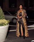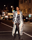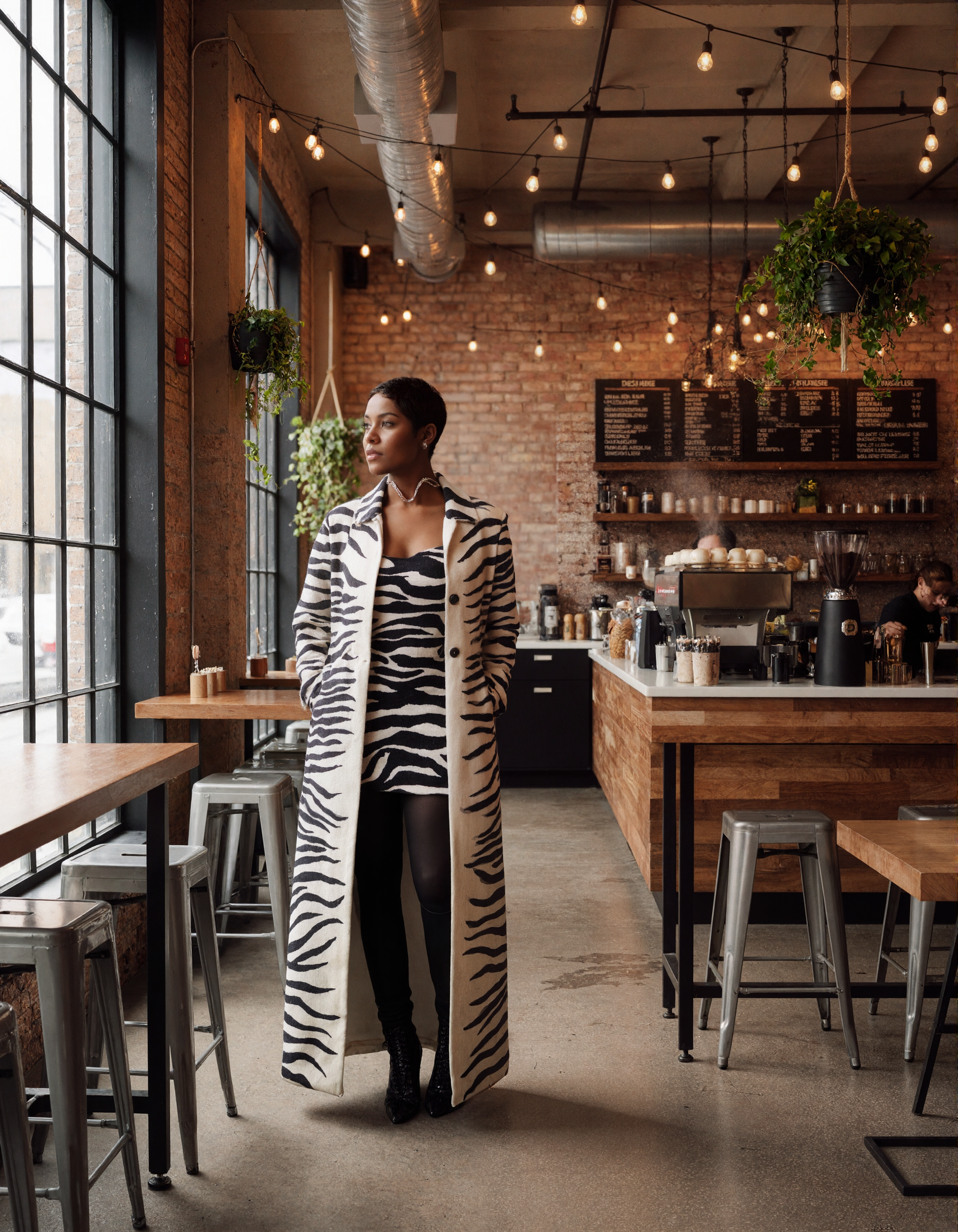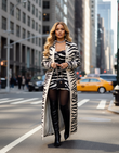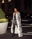 Coat: Long coat with the same zebra print, fitted cut, lapel, button-down closure.